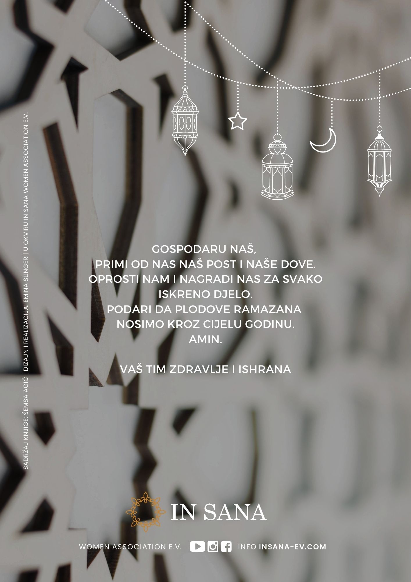 Das Buch ist ein Herzensprojekt unserer Themengruppe »Gesundheit und Ernährung«. Ein besonderer Dank gilt Šemsa Agić, deren Wissen, Leidenschaft und Engagement für gesunde Ernährung dieses Buch möglich gemacht haben. Dieses e-Book entstand aus reiner Ehrenamtsarbeit, umfasst über 100 Seiten und ist das Ergebnis von viel Leidenschaft, Wissen und Engagement, insbesondere für eine bewusste Ernährung im Ramadan.